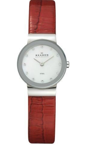 Fashion styling. Red snake leather strap looks playful connected to the shiny silver stainless steel round and slim case with mirror border. The dial is Mother-of-Pearl with 12 indicators made with SWAROVSKI ELEMENTS. Japanese Quartz Movement 30 Meters / 100 Feet / 3 ATM Water Resistant 23mm Case DiSkagen Denmark Womens Watch Silver Round Glitz #358XSSLR8A3 Do not Miss!! Fashion styling. Red snake leather strap looks playful connected to the shiny silver stainless steel round and slim case with mirror border. The dial is Mother-of-Pearl with 12 indicators made with SWAROVSKI ELEMENTS. Japanese Quartz Movement 30 Meters / 100 Feet / 3 ATM Water Resistant 23mm Case Di... Skagen Denmark Womens Watch Silver Round Glitz #358XSSLR8A3